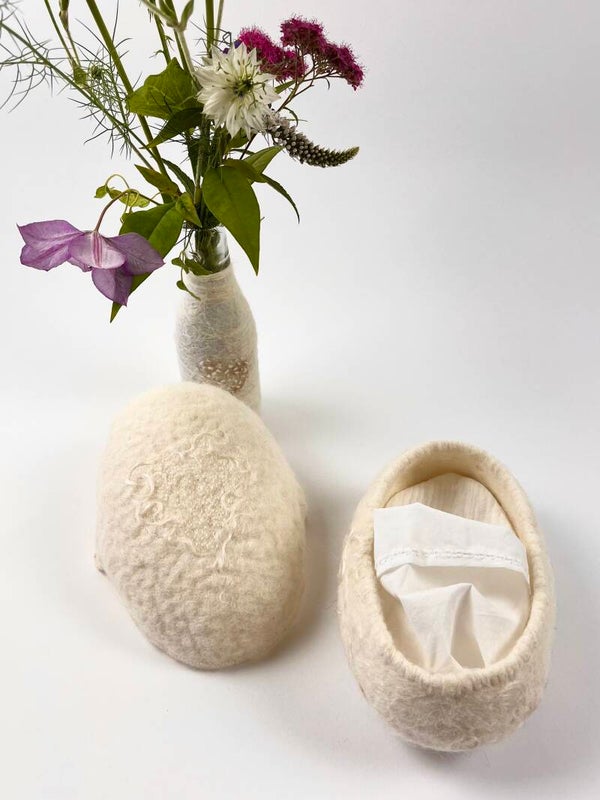 Het afscheidsmandje is gemaakt van natuurlijke materialen (schapenwol, matras en lakentjes van katoen).